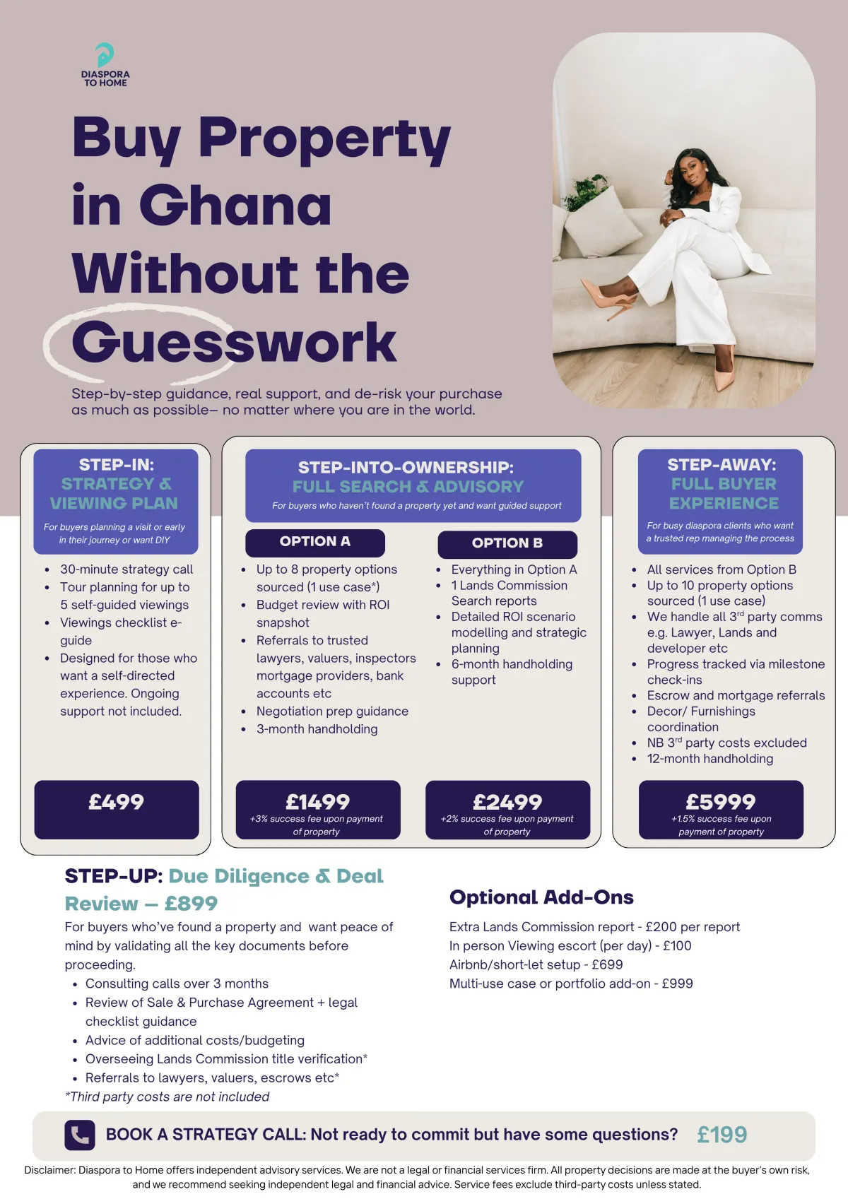 Disclaimer: Diaspora to Home provides independent consultancy, advisory and support services for property buyers. While we connect clients to properties, vetted professionals (e.g. lawyers, valuers, inspectors), all final decisions and contracts are the sole responsibility of the buyer. Service fees do not include taxes, legal fees, or third-party costs unless explicitly stated. Results may vary, and we do not guarantee property appreciation or investment returns. Please seek independent financial or legal advice before making any property purchase.